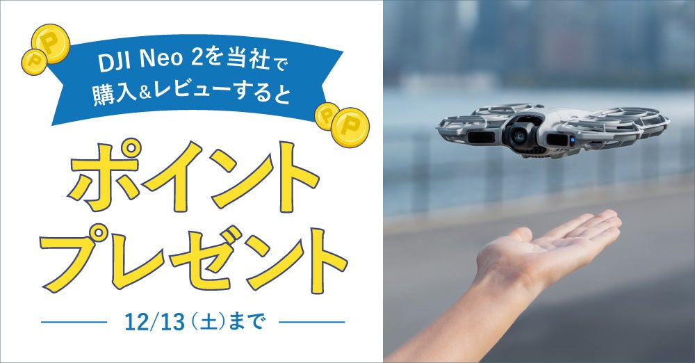 対象期間中にシステムファイブでDJI Neo 2を購入し、商品を実際にお使いいただいた感想を条件に沿ってレビューを投稿していただくと、採用時に次回のお買い物でご利用可能なポイントを最大2,000円分(2,000ポイント)プレゼントいたします。