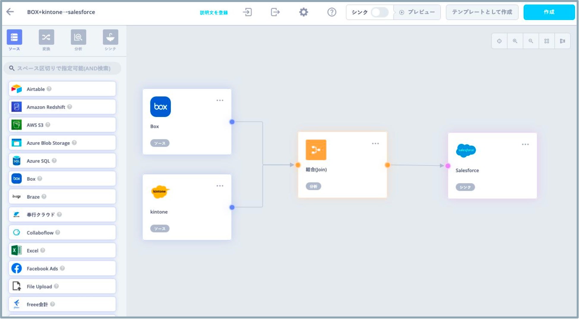 ・Boxに保存されたファイル(CSVなど)を、ノーコードで柔軟にデータ加工し、自動的に多様なSaaSに連携します。