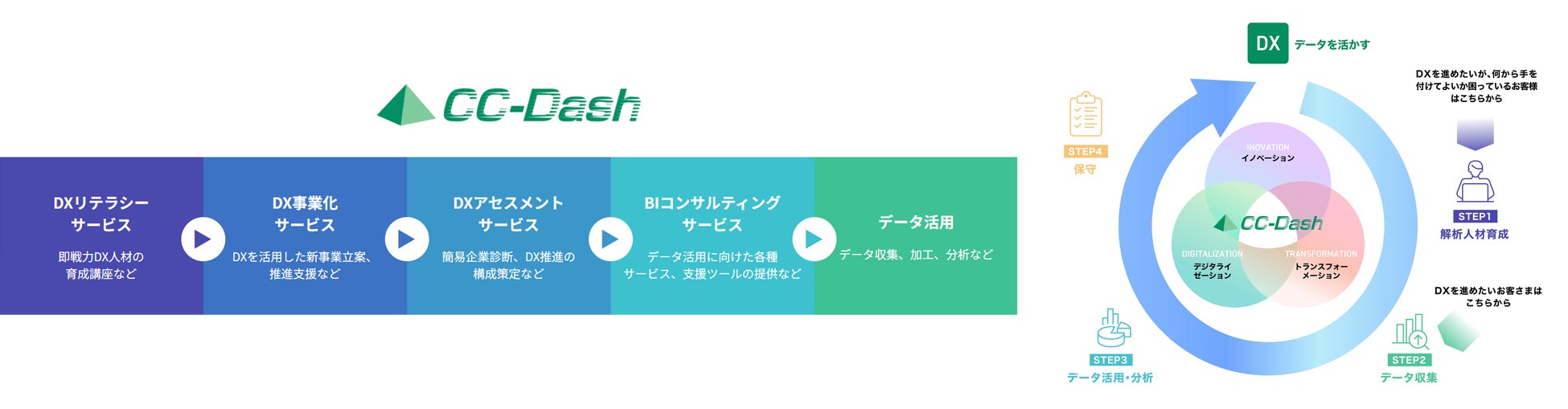 「CC-Dash」(https://xcc-dash.jp/)は、データ活用によってお客様のDX推進を支援する当社独自のフレームワークです。DXを推進する際の各フェーズ(①知る ②つくる ③集める ④整える ⑤分析する ⑥活かす)における様々な課題に対し、テンプレート化と各種コンサルティングサービスをお客様に提供しています。加えてアライアンス等によってソリューションサービスのラインナップを随時追加・拡充していくことで、お客様のDX推進状況に合わせた支援策をワンストップで提供してまいります。