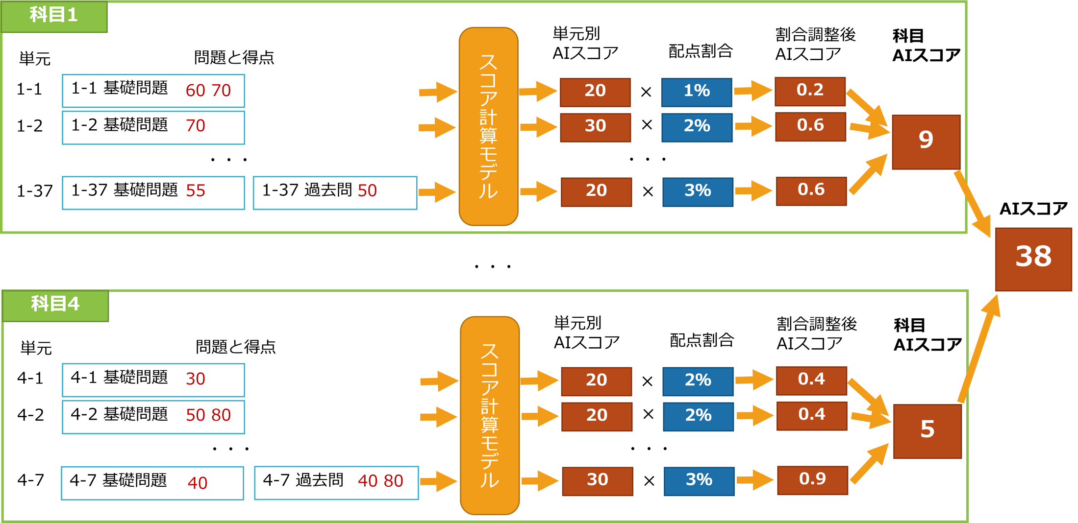 「AI実力スコア」では、単元ごとのAI実力スコアを求め、それをもとに単元の配点割合を調整したうえで科目ごとのAI実力スコアを求め、最終的に試験全体のAI実力スコアを計算します。