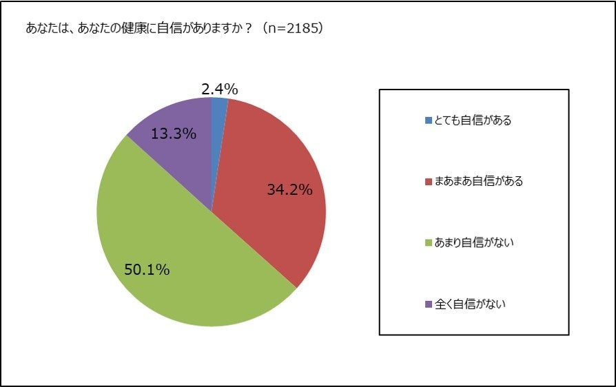 最後に、健康に自信があるかどうか聞きました。全体では、「とても自信がある」2.4%、「まあまあ自信がある」34.2%で合わせて36.6%の人が自信があると答え、「あまり自信がない」50.1%、「全く自信がない」13.3%で合わせて63.4%で、記憶力への自信と似た傾向が見られました。記憶力・体力・健康の中では、体力に自信がない人が最も多いようです。