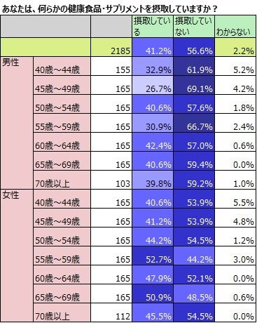 対面の会話や外出の機会が減っていることは、ある程度想像できていましたが、人と話すことが好きな人よりも、あまり好きでないと答えた人の方が多かったことは驚きでした特に40代では、男性よりも女性の方が好きでないと答えた人が多いことがわかりました。コロナ禍で、会話が減ったことにより、より人との会話を求め、会話が好きだと再認識している人の方が多いのではないかと予想していましたが、そうではないことがわかりました。コロナ禍となり、より効率性が求められたり、我慢が伴う付き合いから解放されたいと思う気持ちの表れであるかもしれません。ただし、年齢を重ねるほど、人と会わない・話さないということは認知機能を損なうことに繋がりますので、やはり、人との会話を楽しんでいただきたいと思います。また、体力や記憶力について、なんとなく関係はしているであろうということを予想していましたが、明らかに相関することがわかりました。最後に、サプリメントは、健康に自信がない人の方が、摂取するのではないかと予想していましたが、健康に自信がある人の方が摂取しているという現実も見えました。健康寿命延伸のため、健康に自信を持つためにサプリメントを摂取するという考え方もあると考えられ、上手に取り入れていただきたいと考えます。