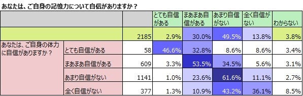 記憶力に「とても自信がある」人の半数が、体力も「とても自信がある」。