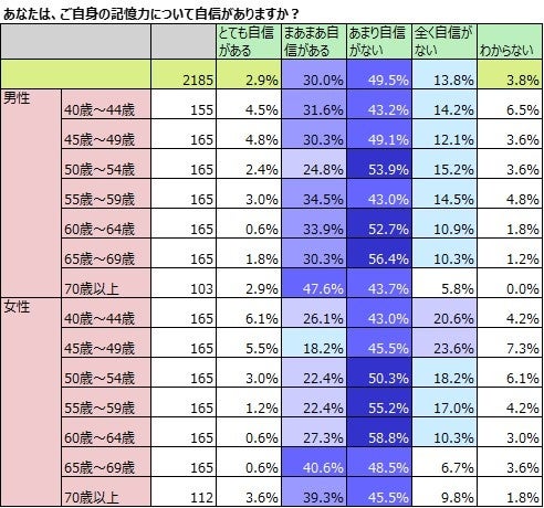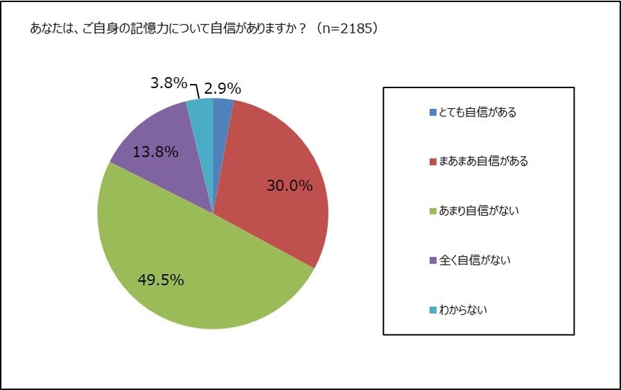 ご自身の記憶力について、自信があるかどうか聞きました。全体では、「とても自信がある」2.9%、「まあまあ自信がある」30.0で、合せて32.9%。「あまり自信がない」49.5%、「全く自信がない」13.8%を合わせて、63.3%と6割を超える人が記憶力について「自信がない」と答えました。