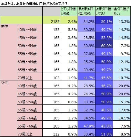 年齢性別で見てみると、記憶力・体力への自信と同様に、半数の「あまり自信がない」人では、年齢性別で大きな差がないようです。60代後半女性は、「まあまあ自信がある」と答えている人が47.9%と、「あまり自信がない」43.0%を超えて多く、「全く自信がない」と答えているのは40代全般の女性で2割を超え、多くの女性が健康不安を抱えているようです。