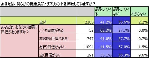 「とても自信がある」と答えた人の6割超がサプリメントを摂取しており、自信がない割合が高いほど、摂取率が下がる傾向。