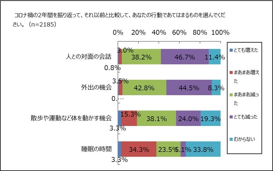 長引くコロナ禍の生活が続いていますが、普段の何気ない生活も、長期化すると、じわじわと大きな変化に繋がる可能性があると考えられます。今回の調査は、特に人の認知機能に影響を与える会話や、体力に繋がる運動や外出などに焦点をあてたものです。