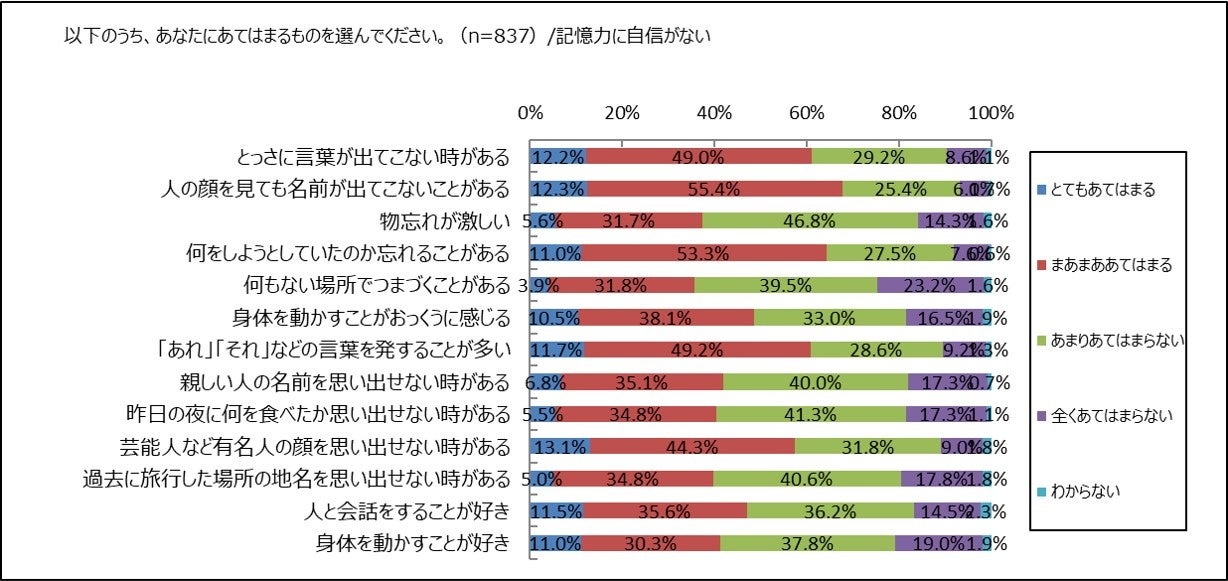 3. あてはまるのが多い順、「人の顔を見ても名前が思い出せない」、「何をしようとしていたか忘れることがある」、「とっさに言葉が出てこない時がある」 「『あれ』・『それ』などの言葉を使うことが多い」。
