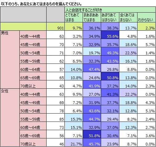 また、人と会話をするのが好きか否か聞いた質問では、全体では「あてはまる」と答えた人は45.8%、「あてはまらない」と答えた人が52%で、会話をするのが好きでない人の方が多いとわかりました。最も「あてはまらない」と答えた人が多いのは、40代前半の年齢層で、男性で60.4%、女性では63.5%の人が「あてはまらない」と答えています。40代後半でも、男性54.3%、女性56.5%と人と会話をすることが好きでない人の方が多数派です。「会話をすることが好き」にあてはまるのは多いのは65歳以上の女性で、約6割の人が好きに「あてはまる」と答えています。一般的には、女性の方が、人との会話が好きなような印象がありますが、一概にそうとは言えない実態がわかりました。