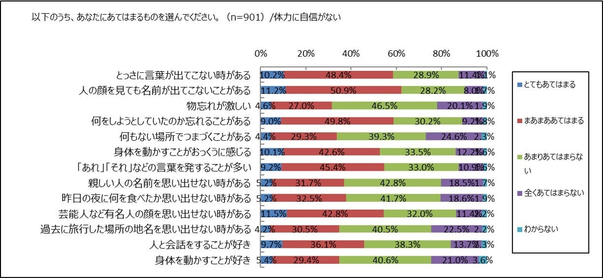 記憶力に自信がないと答えた837名と、体力に自信がないと答えた901名にそれぞれ、あてはまるものを選んでもらいました。2.でわかったように、記憶力と体力の自信には相関関係がありましたが、あてはまるものとして、選んだものも似ている傾向がありました。忘れがちなものとしてあてはまるもので多いのは、「人の顔を見ても名前が思い出せない」・「何をしようとしていたのか忘れることがある」・「とっさに言葉が出てこないことがある」・「『あれ』『それ』などの言葉を使うことが多い」は拮抗して多く、約6割の人が「あてはまる」と答えています。体力に関わる「何もない場所でつまずくことがある」は、記憶力に自信がない人では、35.7%が「あてはまる」と答え、体力に自信がない人では、33.7%の人が「あてはまる」と答え、「身体を動かすのがおっくうに感じる」では、記憶力に自信がない人は、48.6%の人が「あてはまる」と答え、体力に自信がない人は52.7%の人が「あてはまる」と答えていることから、あまり差がないことがわかりました。また、「身体を動かすことが好き」にあてはまるかどうかの質問では、記憶力に自信がないと答えた人が、41.3%「あてはまる」と答え、体力に自信がないと答えた人は、34.8%の人しか「あてはまる」と答えませんでした。体力に自信がない人は、身体を動かすのが好きではない人が6割と超えることがわかりました。