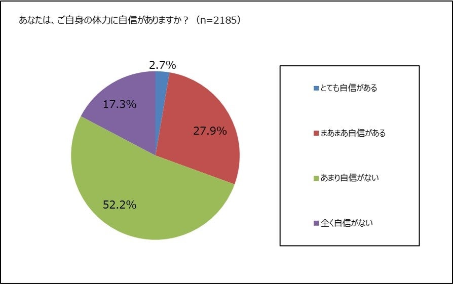 次に、ご自身の体力に自信があるかどうか聞きました。全体では、「とても自信がある」2.7%、「まあまあ自信がある」27.9%で、合せて30.6%と、約3割の人が自信があり、「あまり自信がない」52.2%、「全く自信がない」17.3%の合わせて69.5%と約7割の人が自信がないと答えていることから、記憶力よりも体力に自信がない人の方が多いことがわかりました。