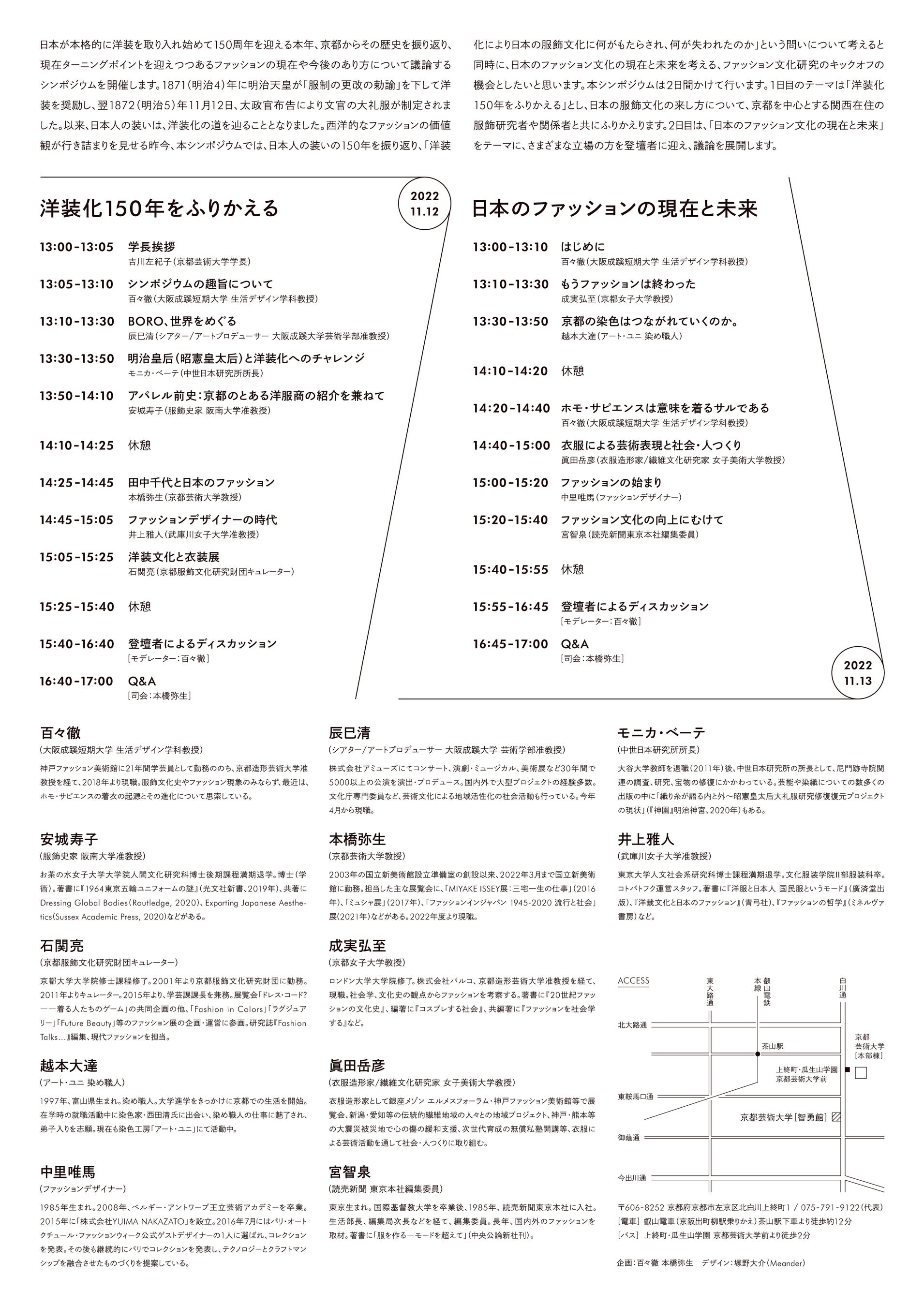 - 日本の洋装化150周年記念シンポジウム「日本人にとっての洋服とは何か?新しいファッションの中心としての京都の可能性」