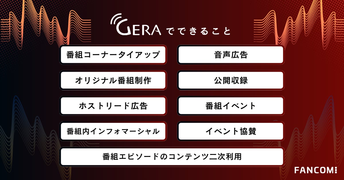本サービスは、GERAでパーソナリティーを務めるお笑い芸人、タレントの既存番組内のコーナーを使ったタイアップや、ゼロから一社提供の特別オリジナル番組を立ち上げることも可能です。
