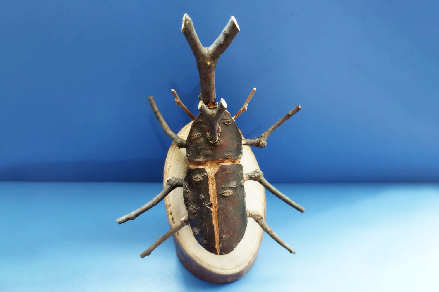 木製のカブトムシや夏の花を使った寄せ植え、リースなど木材や自然の素材を使った作品作りを体験できます。
