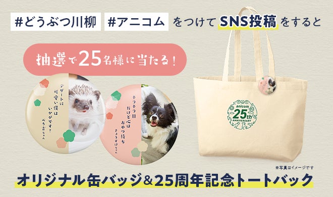 できた画像を開催期間中にハッシュタグ【#アニコム #どうぶつ川柳】をつけてSNSに投稿いただくと、抽選で25名様に、作品とお写真でお作りする「オリジナル缶バッジ」と、「アニコム25周年記念トートバッグ」をプレゼントいたします。また素敵な投稿は、アニコム公式HP・SNSにてご紹介いたします。