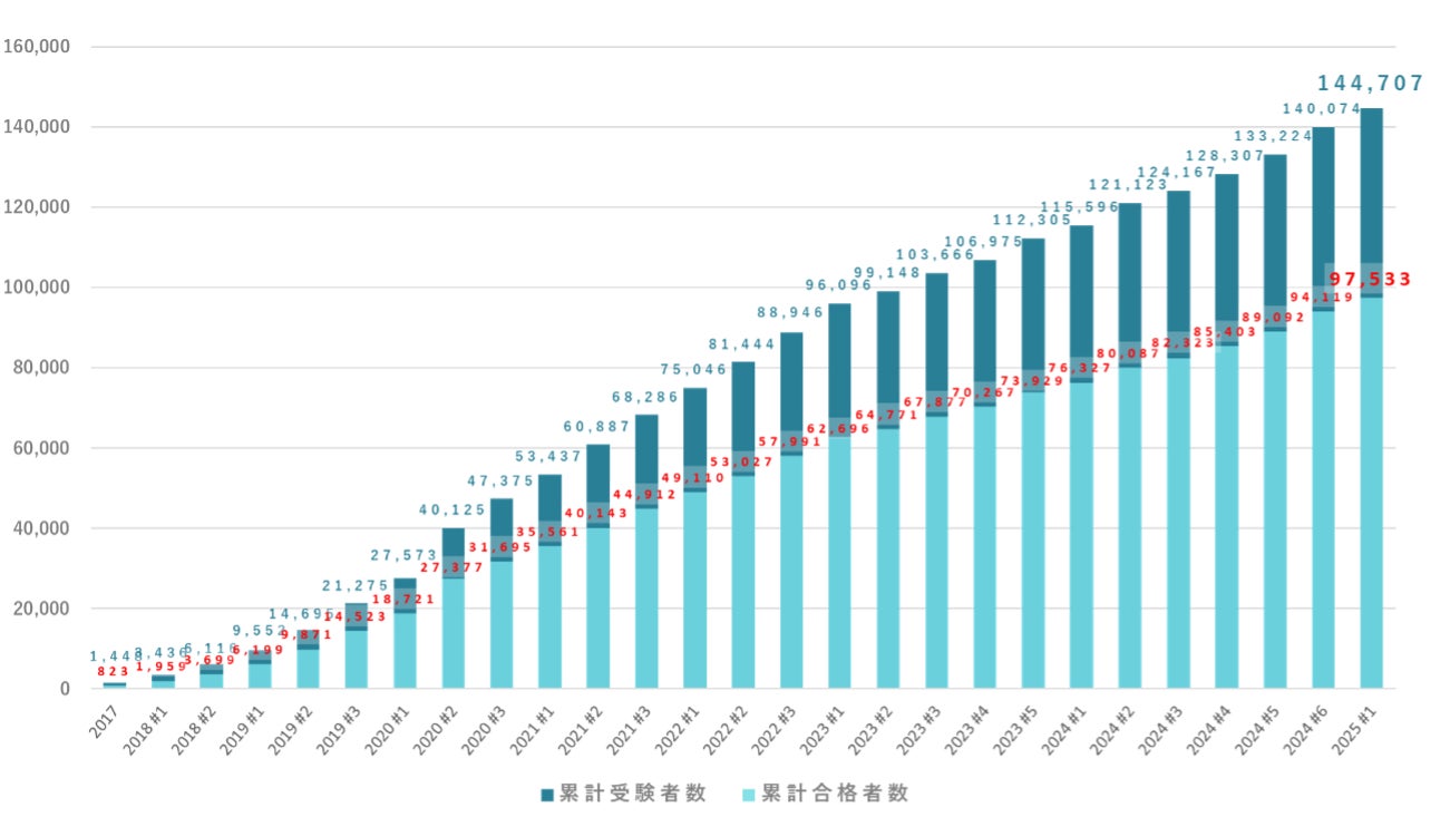 これにより、G検定の累計受験者数は144,707名、累計合格者数は97,533名になりました。