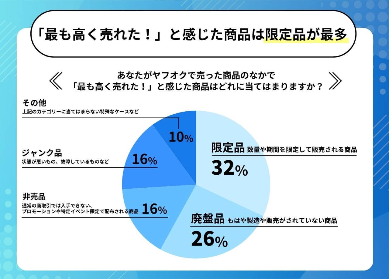 ・ヤフオクで売った商品で「最も高く売れた」と感じたものは「限定品(数量や期間を限定して販売される商品)」が32.0%、次いで「廃盤品(もはや製造や販売がされていない商品)」26.0%でした。