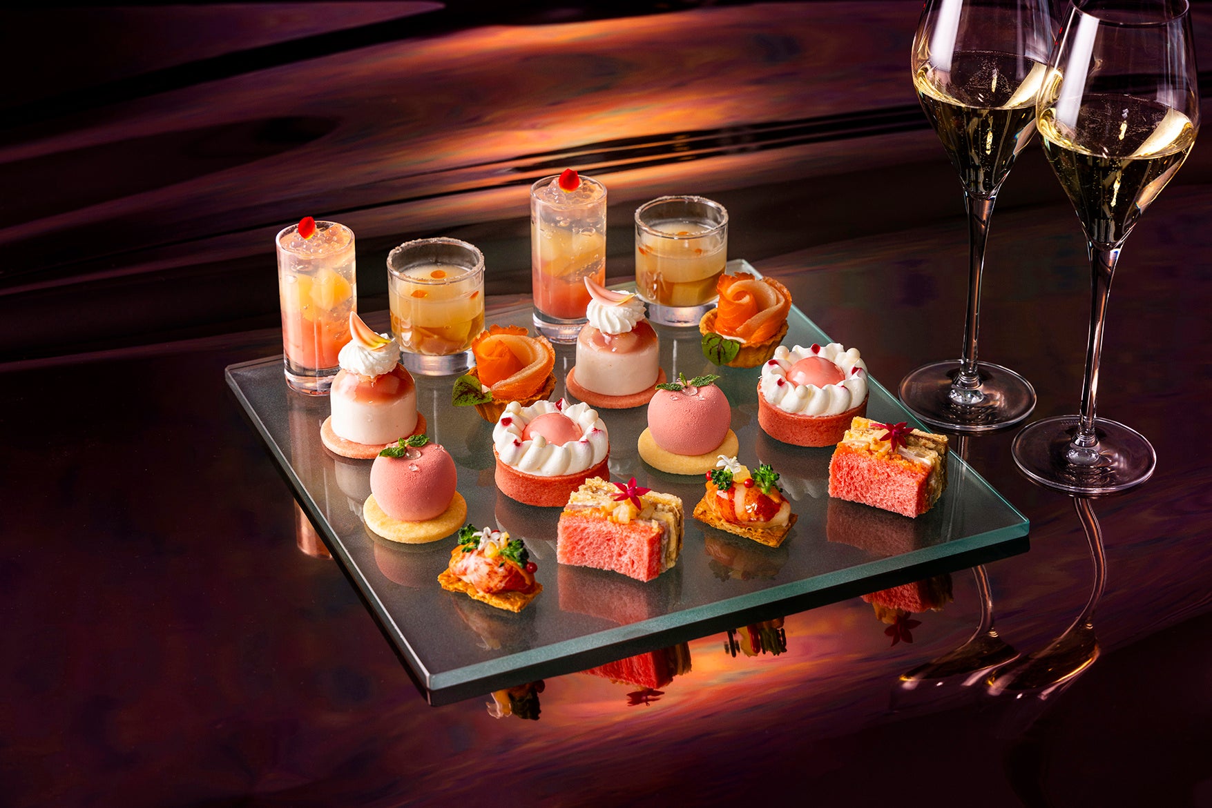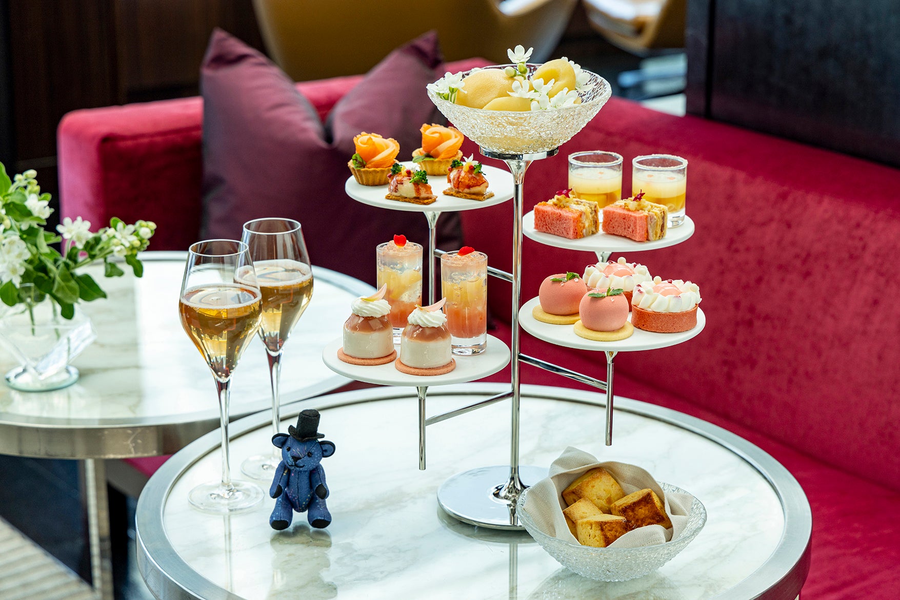 デラックスアフタヌーンティーでは、乾杯のシャンパーニュに加え、国産のフレッシュピーチと、オマール海老の豊かな風味とピーチのやわらかな甘味を合わせた「オマール海老と桃のタルタルのクネル仕立て バジルの香り」をお楽しみいただけます。また、同期間中18時30分からは、セイボリーとスイーツ各4種とともに、ビールやスパークリングワインなどのフリーフロードリンクを堪能する「ピーチナイトティー」をご用意します。