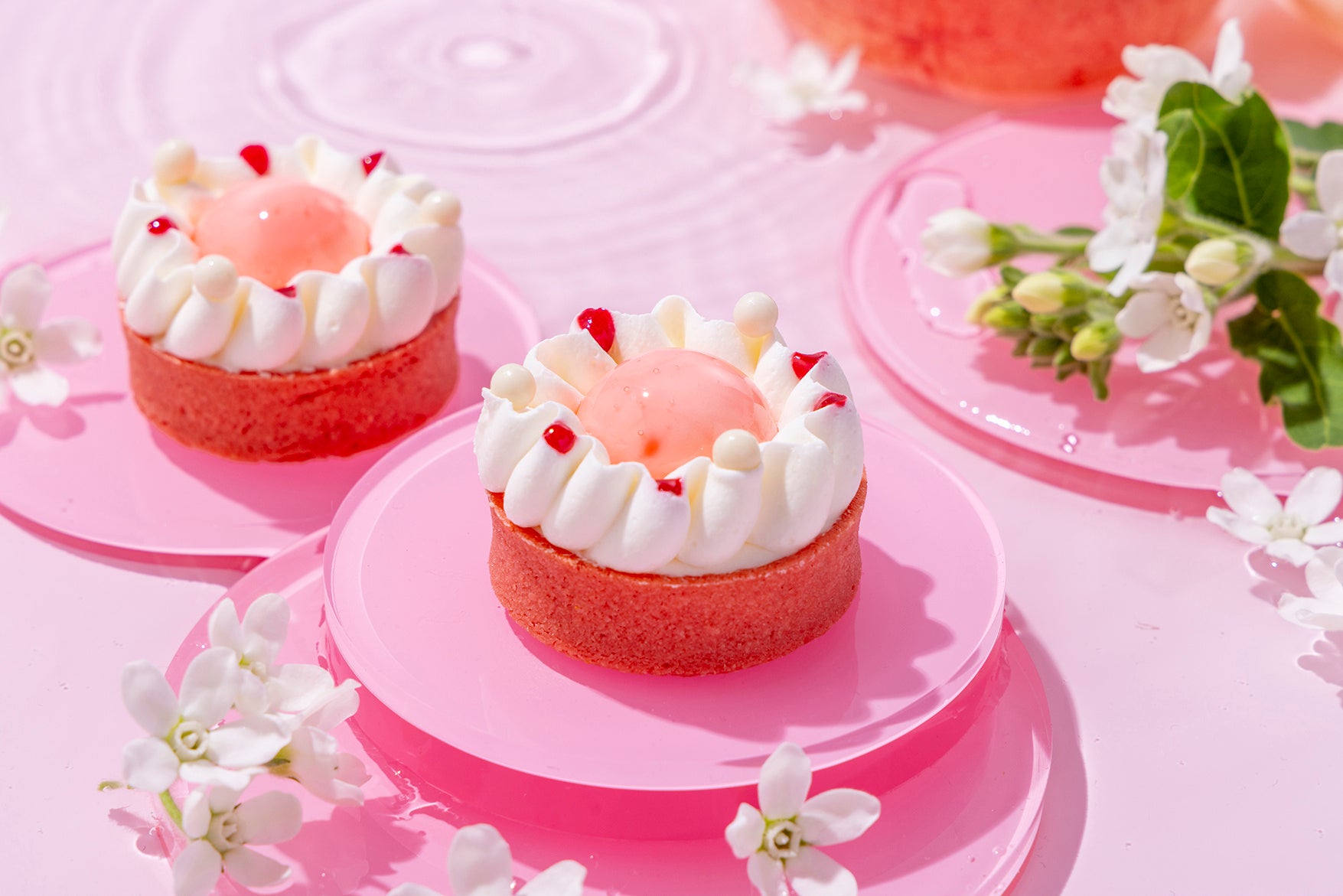 香ばしいタルトにピスタチオガナッシュを入れ、ココナッツムースとホイップクリームで花を表現。コクのある味わいとしっかりとした食感をお楽しみいただける、満足感たっぷりの一品。