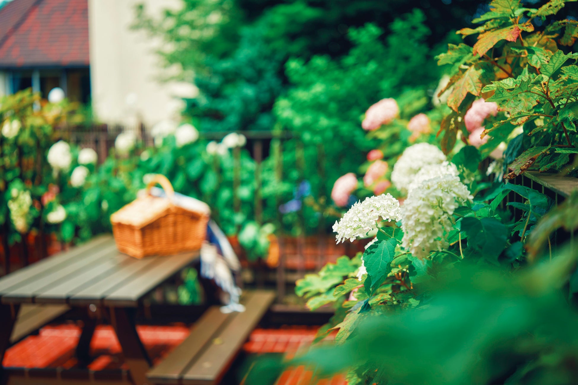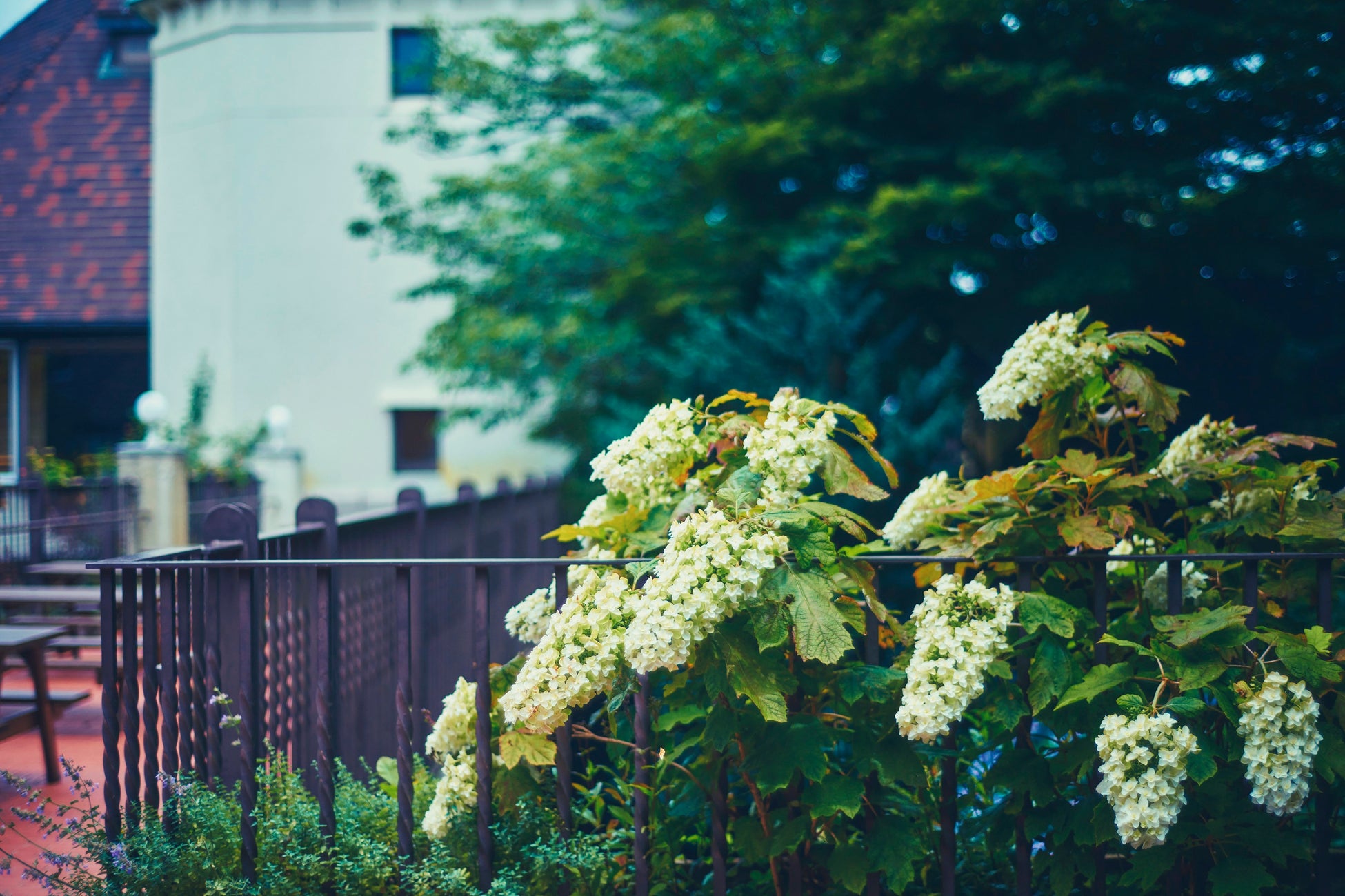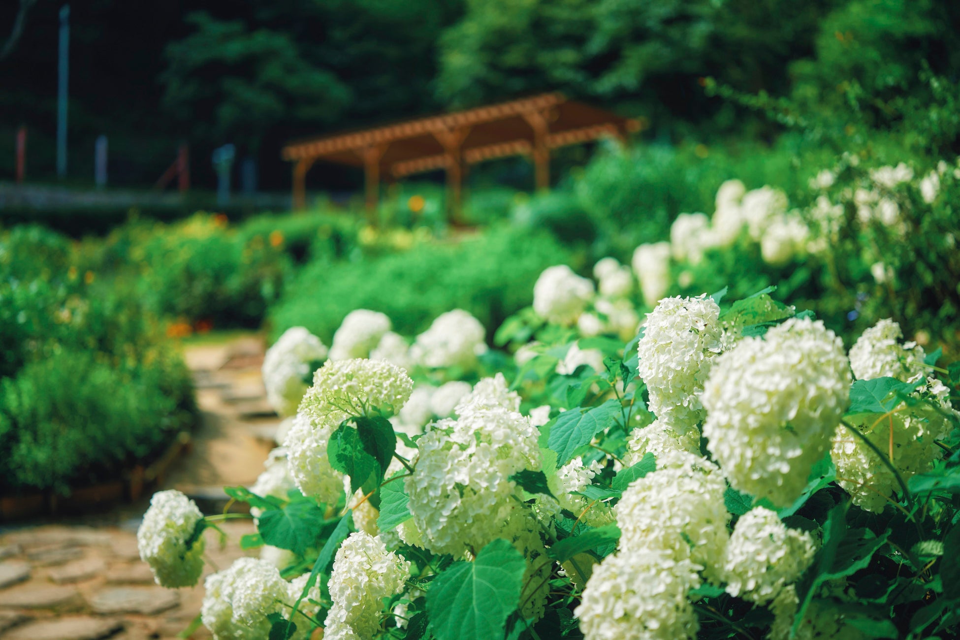 おもてなし、くつろぎ、よろこび、いやしの4つのコンセプトからなる「四季の庭」。グリーンから、白へと花色の変化が美しい「アナベル」や「カシワバアジサイ」、「ヤマアジサイ」などのアジサイとともに季節のハーブや草花との競演を楽しめるのも「四季の庭」の魅力です