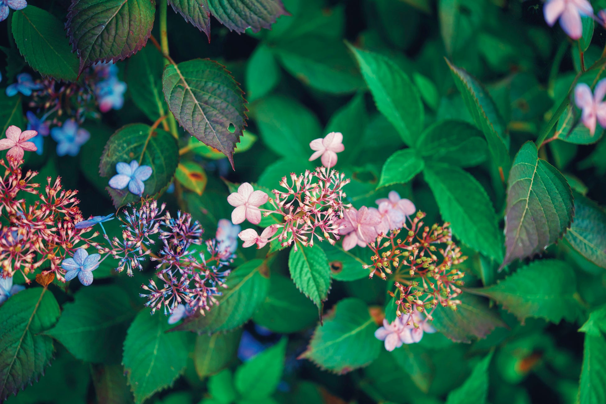 ガーデン各所で色、花姿の異なる多彩なアジサイに出会えます