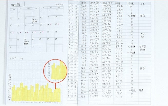 「健康記録手帳」は、必要な項目だけをざっくり簡単に書き込むことができる仕様です。日付も自由に設定できるので、いつからでも始められます。そのため、記録を取るのが苦手な方や、続けられない方でも使いやすいのが特長です。また、記録をグラフ化できる欄もあり、1ヶ月の健康状態を見える化できます。
