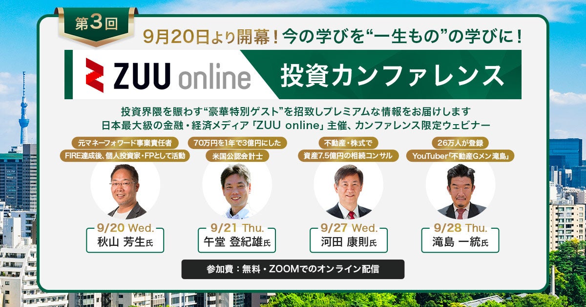 投資のカリスマたちが最新の投資戦略や業界の動向、成功の法則を余すことなく語る『ZUU online 投資カンファレンス』、9/20(水)-28(木)開催 <参加費無料・事前申込必須>