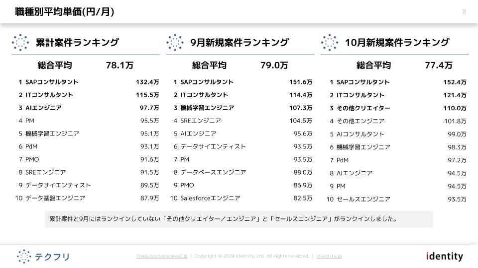 累計案件と9月にはランクインしていない「その他クリエイター/エンジニア」と「セールスエンジニア」がランクインしました。