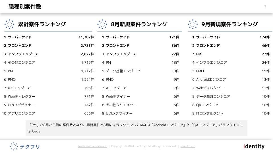 「インフラエンジニア」が9月から倍の案件数となり、累計案件にはランクインしていない「ネットワークエンジニア」と「AIエンジニア」「Androidエンジニア」「ITコンサルタント」がランクインしました。