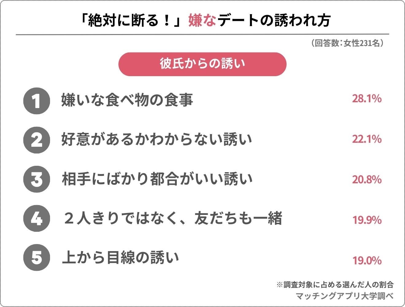 ワースト1位は、彼氏以外の男性ではランク外だった「嫌いな食べ物の食事に誘われる」がランクイン。2位以下は「ヒマだからなど、好意があるかわからない誘い」「待ち合わせ場所などが相手にばかり都合がいい」と続きました。