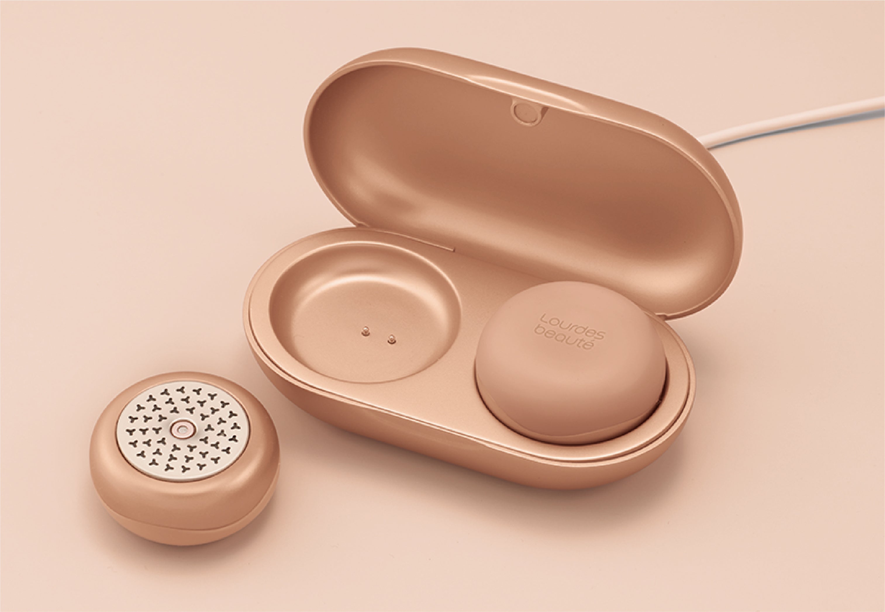 本体にピタッと収納できる充電ケースで、重さ120g(温灸本体+ケース)と軽量です。充電ケーブルをケースに差し込むだけで充電がスタートします。