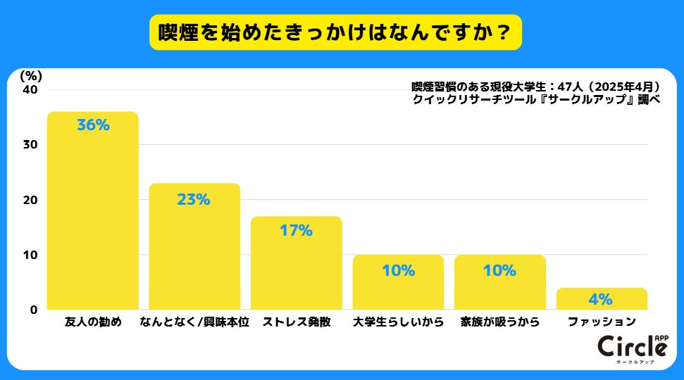 次に、喫煙のきっかけを聞いたところ、「友人の勧め」36%となり、「なんとなく/興味本位」「大学生っぽい」「ファッション/おしゃれ」の雰囲気で喫煙する人が37%という結果となりました。