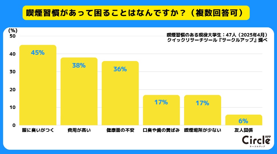 喫煙習慣で困ることとして、「服に臭いがつく」45%、「費用が高い」38%、「健康面の不安」36%と回答する大学生が多くなりました。