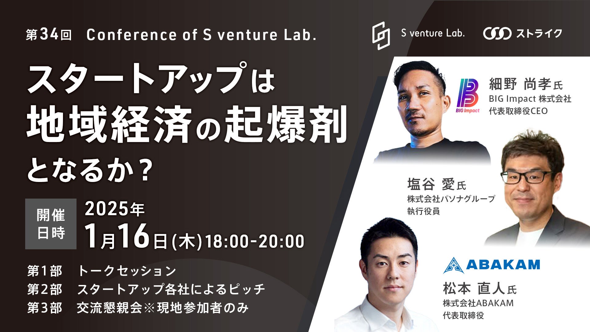 株式会社ストライク(本社:東京都千代田区、代表取締役社長:荒井邦彦)は2025年1月16日(木)に、スタートアップ企業と事業会社の提携促進を加速させるイベント『S venture Lab.』を、アンカー神戸での現地参加とオンラインのハイブリッド形式で開催いたします。