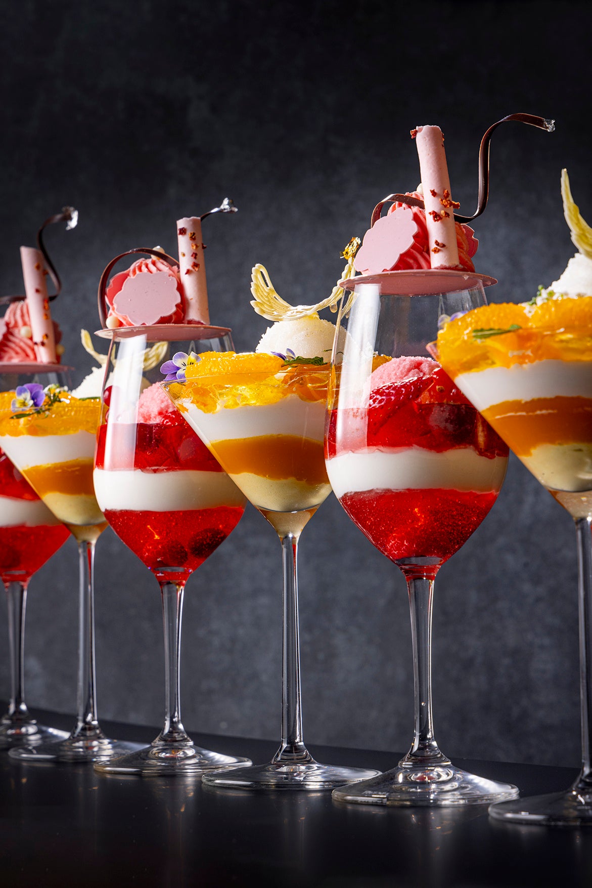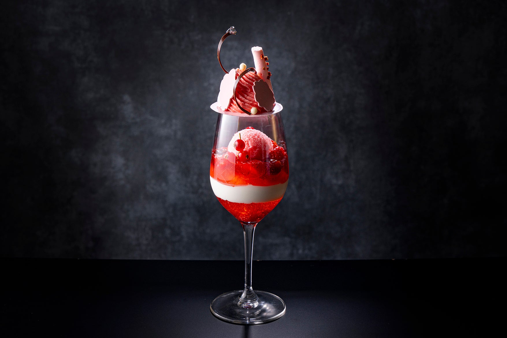 桜の優雅な余韻と赤い果実の甘酸っぱさが広がる「Sakura」は、苺とチェリーのジュレの上にほんのり甘酒香るパンナコッタと、桜風味のジュレを重ねたエレガントな一品。スプーンですくうと、桜花の塩漬けアイスクリームがやさしく溶け合い、春の情景をグラスに閉じ込めたような優しい味わいです。苺、ラズベリー、赤スグリの甘酸っぱさと、キルシュに漬け込んだチェリーをアクセントに、苺のクリームや桜の花びら型チョコレートをトッピングし、艶やかな装いでお届けします。