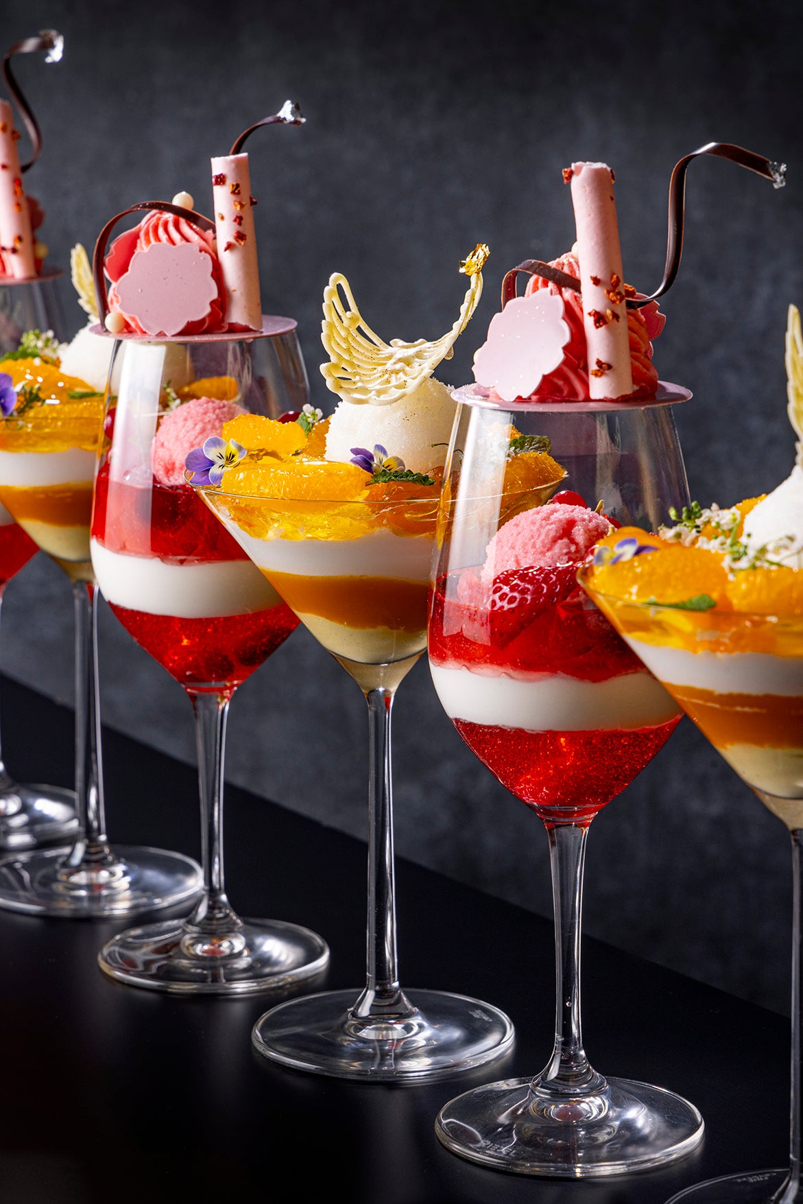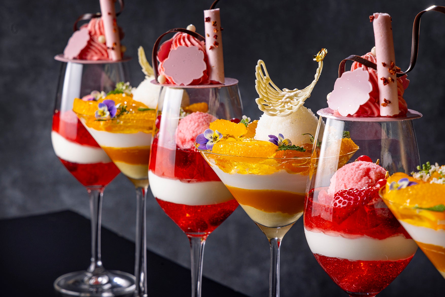 春風を舞う蝶を象ったチョコレートとエディブルフラワーが印象的な「Le Printemps」は、ピスタチオのコクのあるカスタードクリームにアプリコットの甘酸っぱいソース、アーモンド風味のブランマンジェが幾重にも重なり、奥行きのある味わいに。芳醇な香りの貴腐ワインのジュレ、そして瑞々しいデコポンと、クリームチーズのアイスクリームが華やかなハーモニーを奏でます。「Sakura」は¥2,400、「Le Printemps」は¥2,450で、ホテル内2か所のバー限定でお楽しみいただけます。