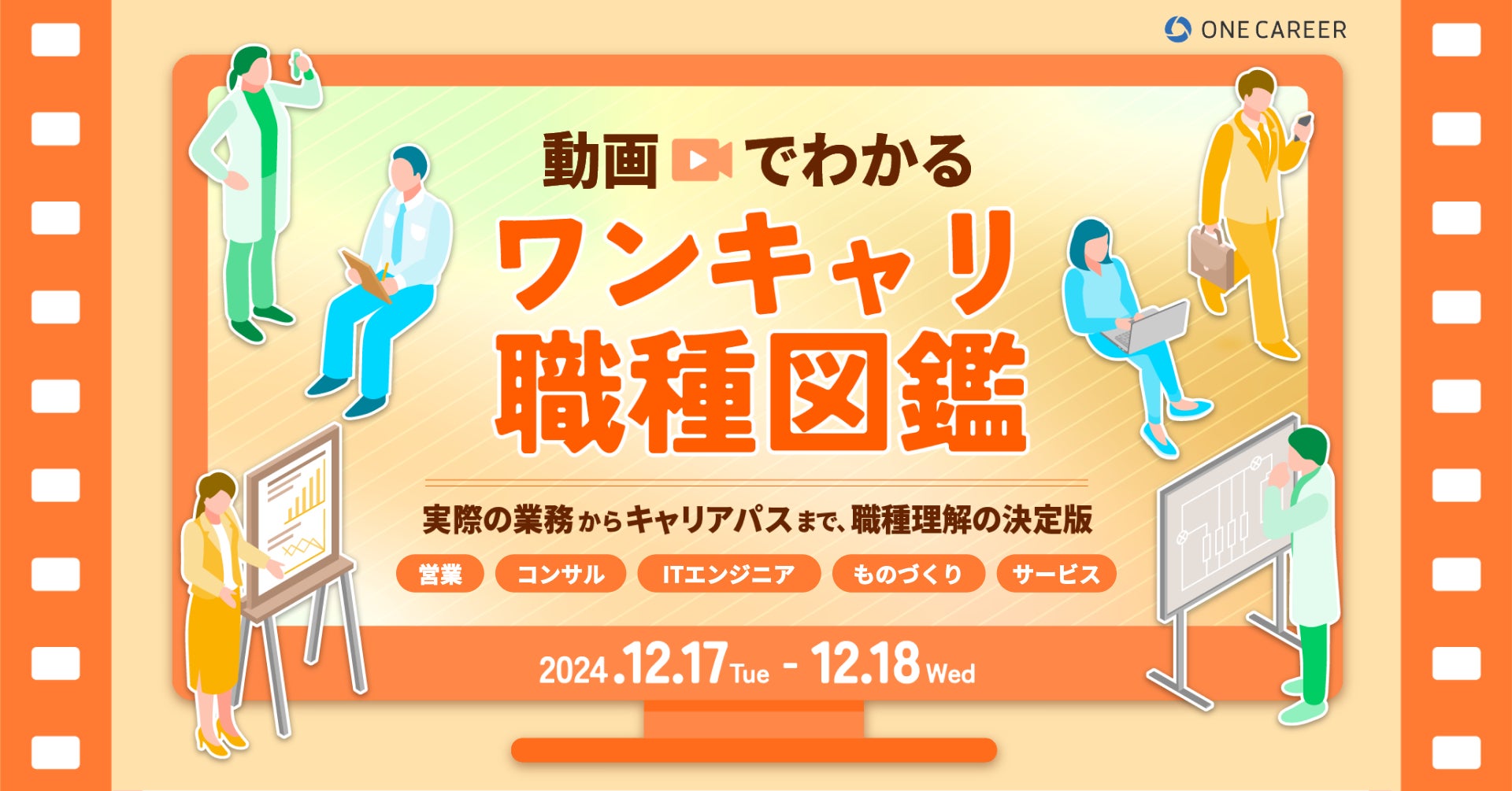 人事向け採用クラウド「ONE CAREER CLOUD」を展開する株式会社ワンキャリア(本社:東京都渋谷区、代表取締役社長 執行役員CEO:宮下 尚之、以下ワンキャリア)は、当社初となる“職種”にフォーカスしたオンラインセミナー『ワンキャリ職種図鑑』を、12月17日(火)・18日(水)の2日間開催します。セールス、コンサル、ITエンジニア、ものづくり系、サービス系の職種について、各業界の企業全35社の先輩社員が登壇し紹介します。なお、職種に特化した大規模なイベントは、当社初の試みとなります。