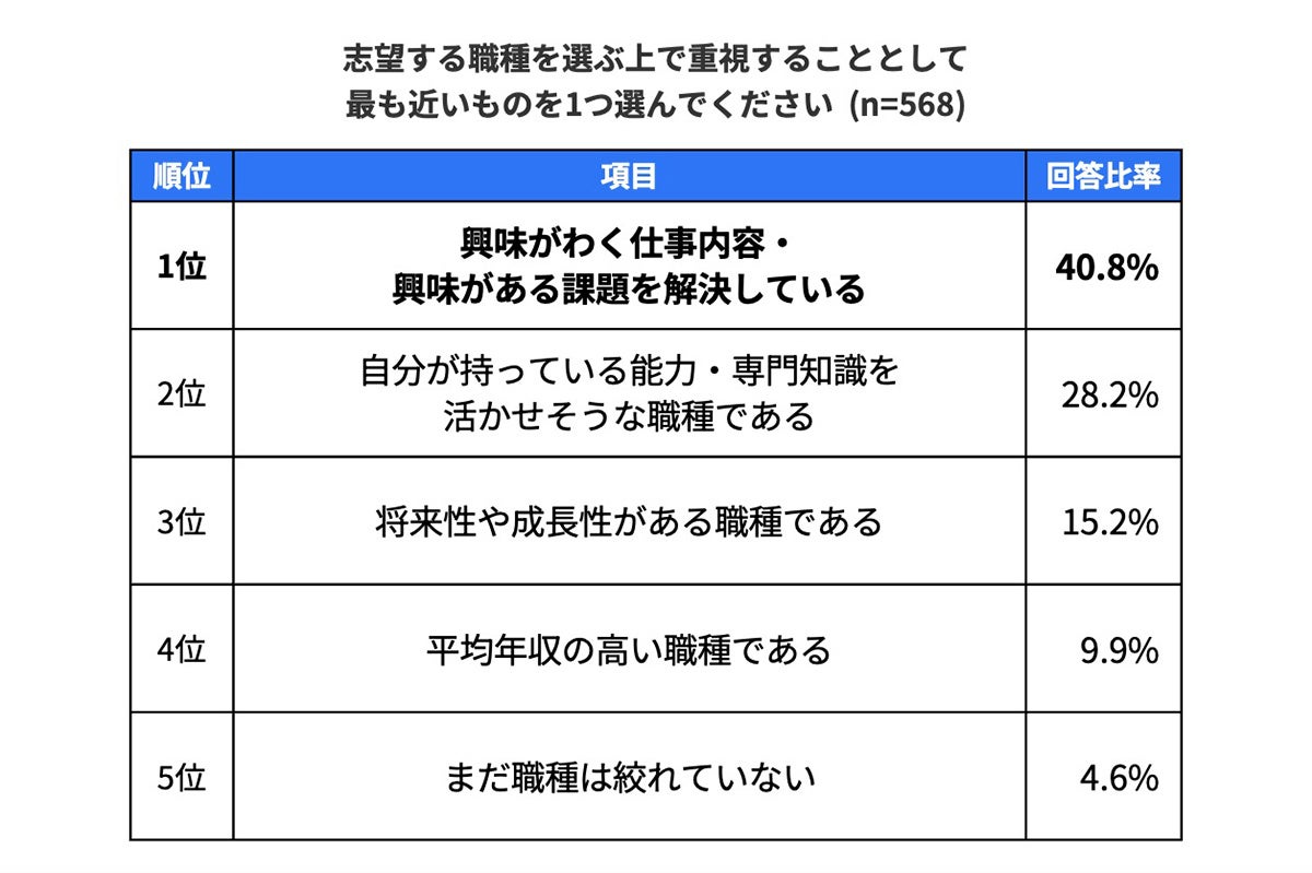 1日のタイムスケジュールから具体的な業務内容や全体像をつかめるほか、職種を選んだ経緯・理由や入社前後のイメージのギャップに関する話題から、キャリア選択におけるミスマッチのリスク低減につなげられます。さらに、その職種で得られる力やキャリアなどに関するトークから、自身の将来のキャリア形成のヒントをつかむことができます。