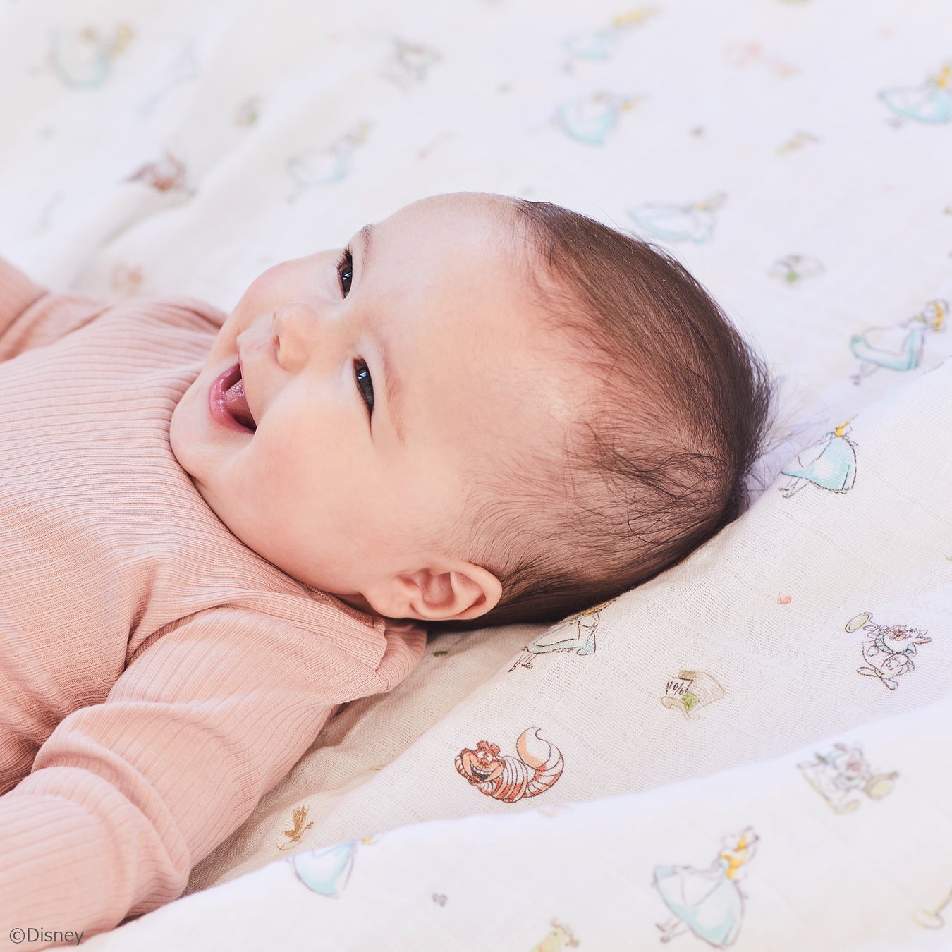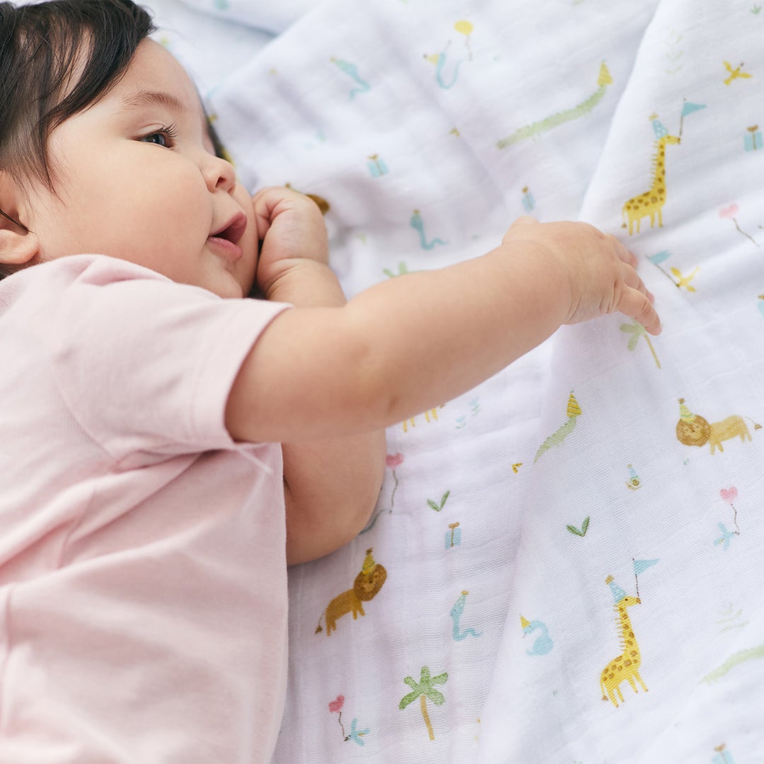 竹を原料とするレーヨンでできた軽くて繊細なシルキーソフトモスリンは、サラリと滑らかな肌ざわりで、赤ちゃんをやさしく包みます。