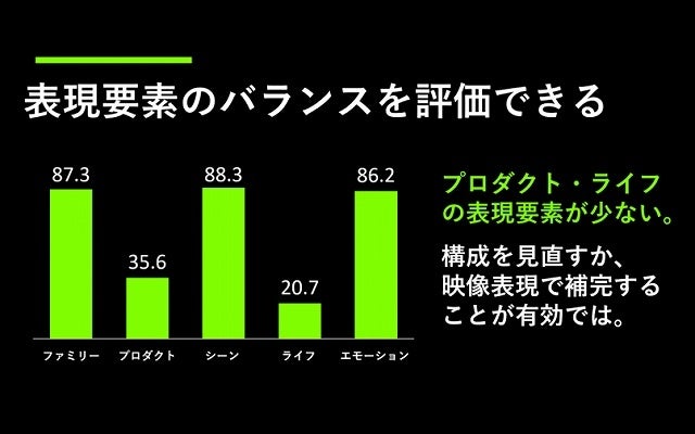 対象となった作品の台本は、「プロダクト」「ライフ」に関わる表現が少なかったことが分かります。BRANDED SHORTSなので「プロダクト」に関わる表現が少ない点は課題ではないかもしれませんが、「ライフ」に関わる表現が少ない点は見直しの余地があったかもしれません。