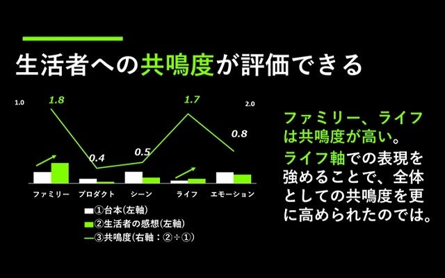 特に情緒的な「ファミリー」や「ライフ」は“共鳴度”が高く、しっかりと生活者に響いたことが分かります。