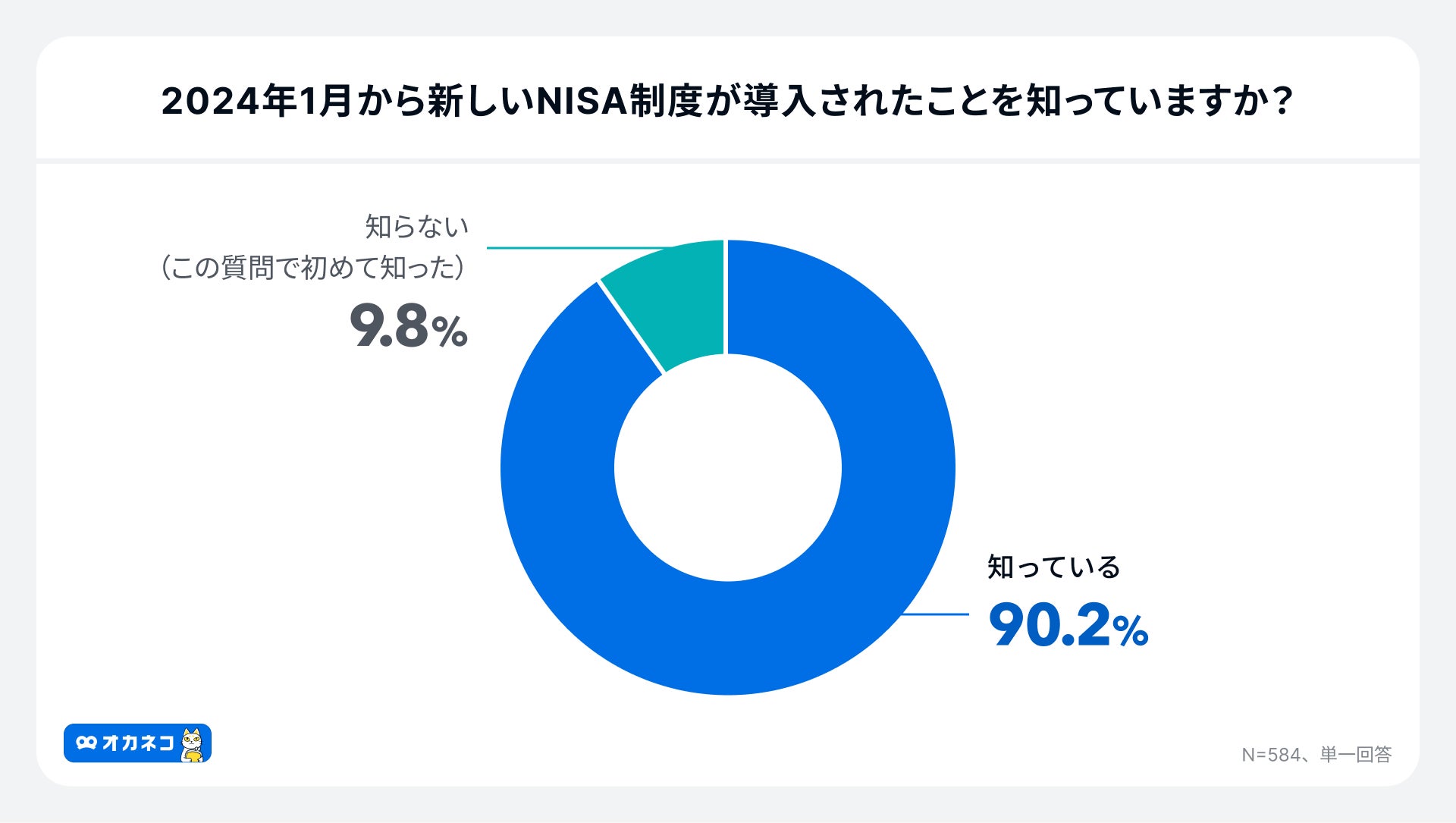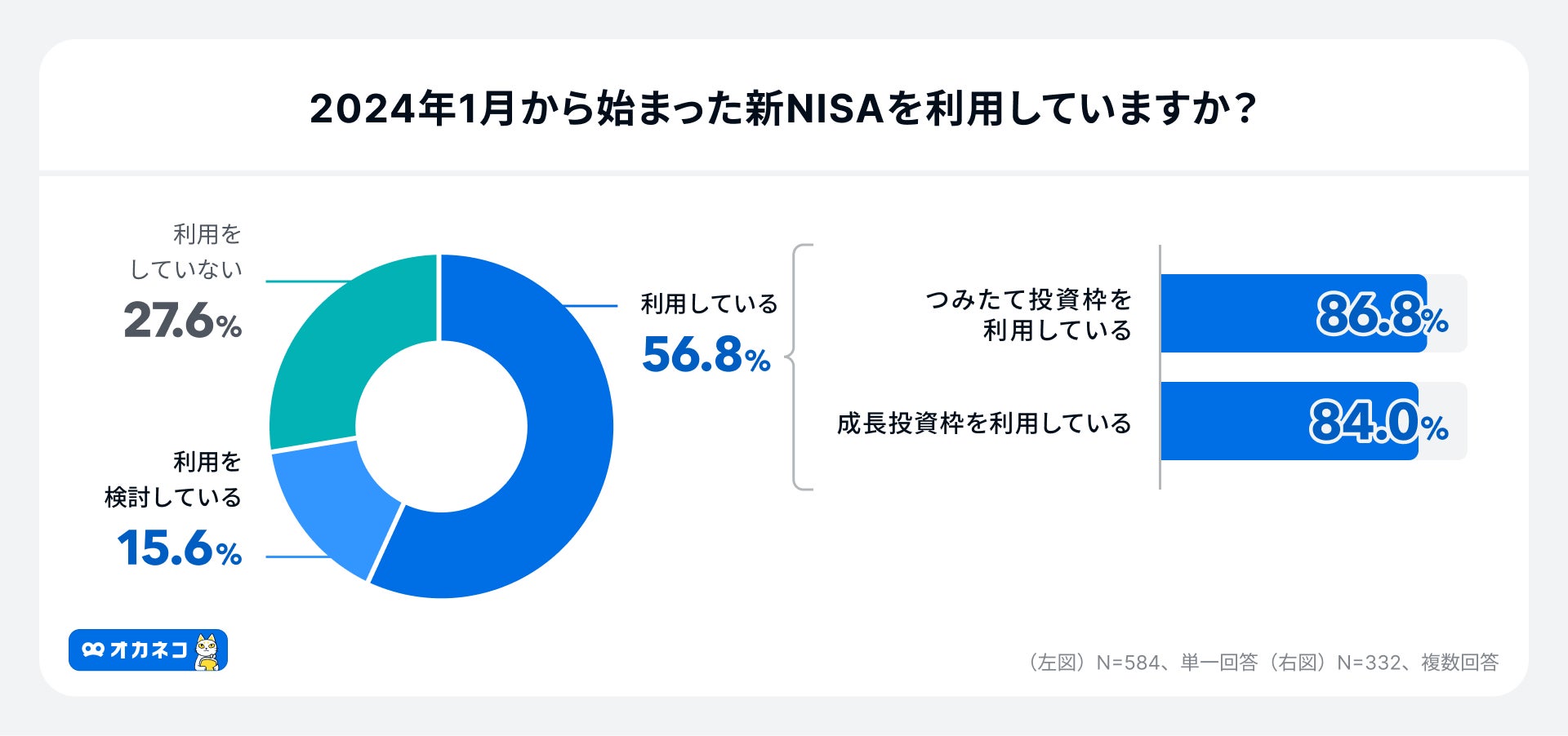 国内最大級(※1)の家計診断・相談サービス「オカネコ」を運営する株式会社400F(フォーハンドレッド・エフ、本社:東京都中央区、代表取締役社長:中村 仁、以下「当社」)は、昨年1月より開始された新NISAに関して、認知度や利用率の実態を探るべく、全国の『オカネコ』ユーザーの584人を対象に「オカネコ 新NISAの利用意向調査2025年1月」を実施しました。