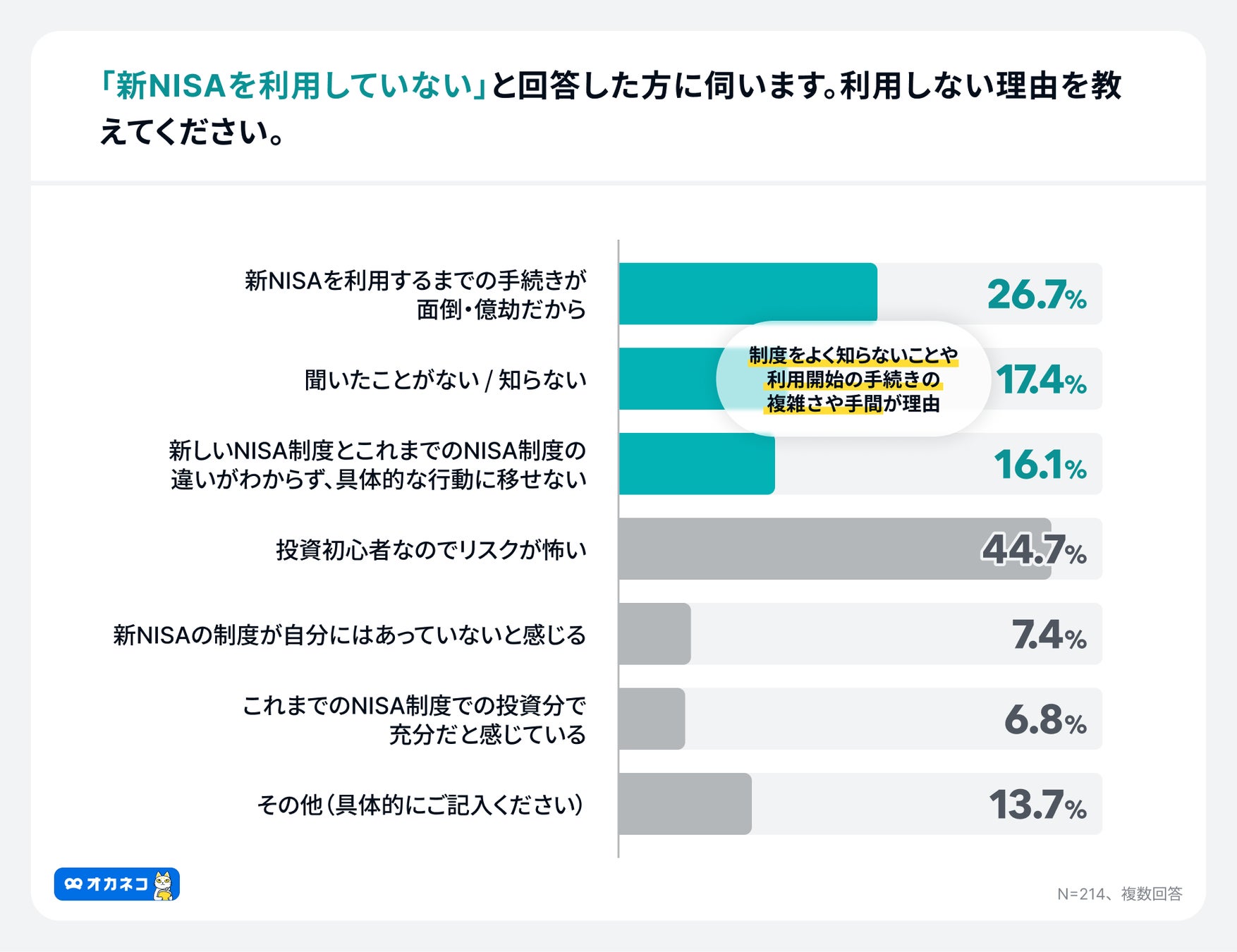 「新NISAを利用していない」と回答した方へ「利用しない理由を教えてください」と質問したところ、「投資初心者なのでリスクが怖い」44.7%と最も多く、次いで「新NISAを利用するまでの手続きが面倒・億劫だから」26.7%、「聞いたことがない/知らない」17.4%、「新しいNISA制度とこれまでのNISA制度の違いがわからず、具体的な行動に移せない」16.1%、「新NISAの制度が自分にはあっていないと感じる」7.4%、「これまでのNISA制度での投資分で充分だと感じている」6.8%という結果になりました。