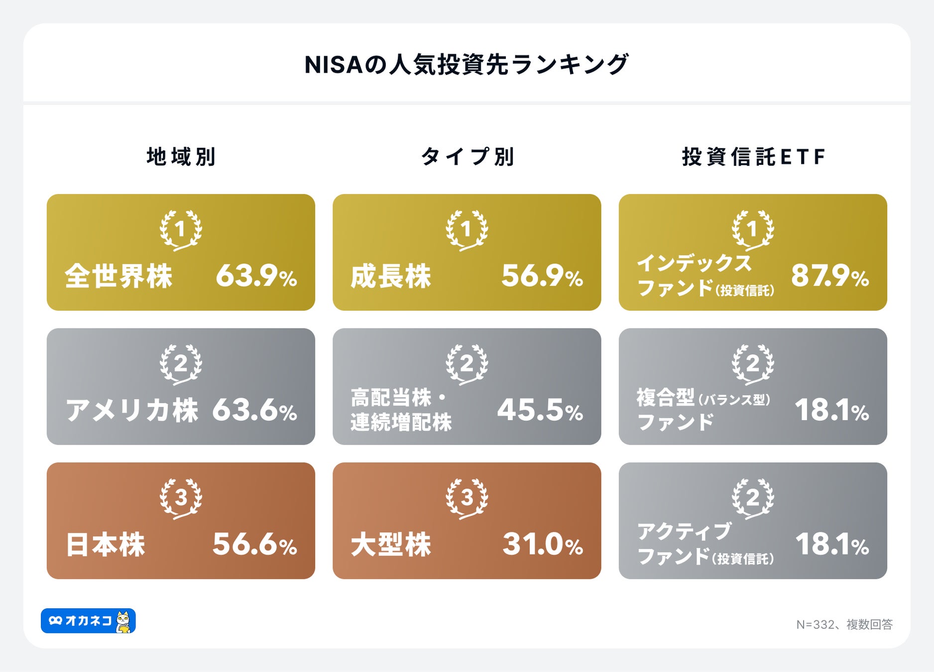 人気の投資先ランキングは? 地域別1位全世界株、タイプ別1位成長株、投資信託ETFのタイプ1位インデックスファンド(投資信託)