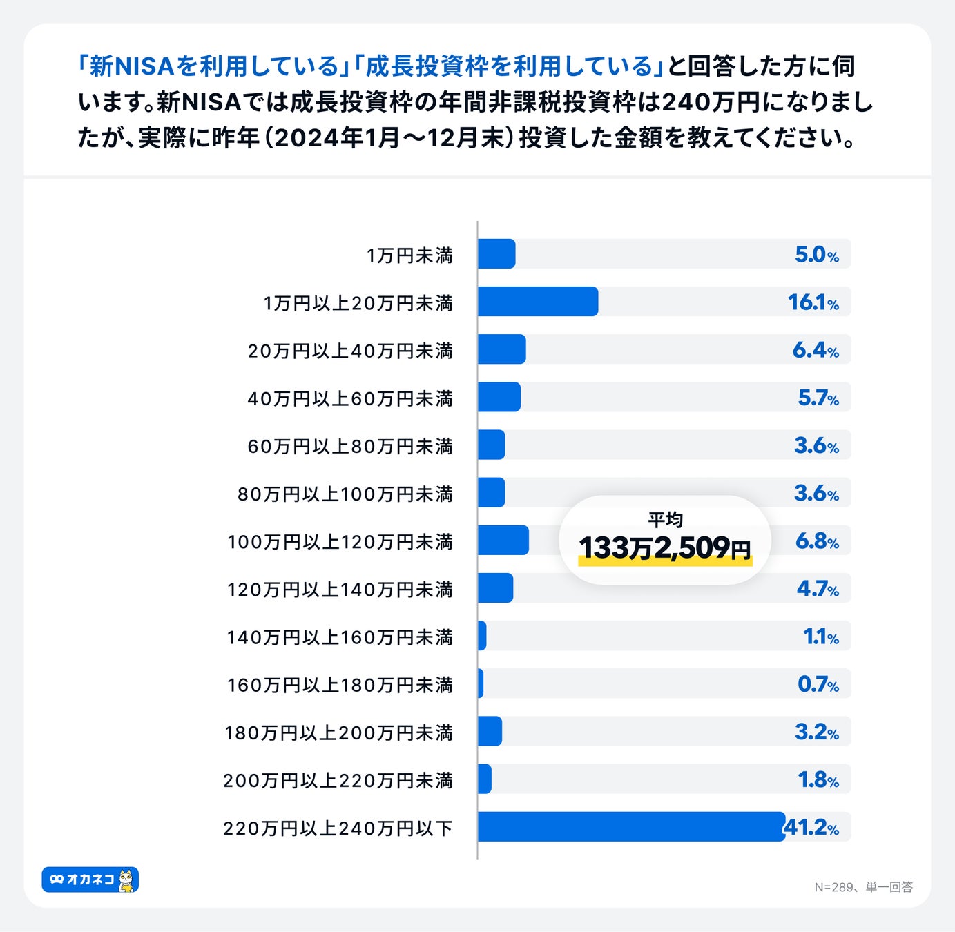 また、「新NISAでは成長投資枠の年間非課税投資枠は240万円になりましたが、実際に昨年(2024年1月~12月)投資した金額を教えてください。」という質問に対しては、「220万円以上~240万円以下」と回答した人が41.2%と最も多く、平均額は133万2,509円となりました。現時点での投資額の分布は、上限に対して控えめな額を選択する方と、上限枠に近い額を選択する方の二極化の傾向が見られました。