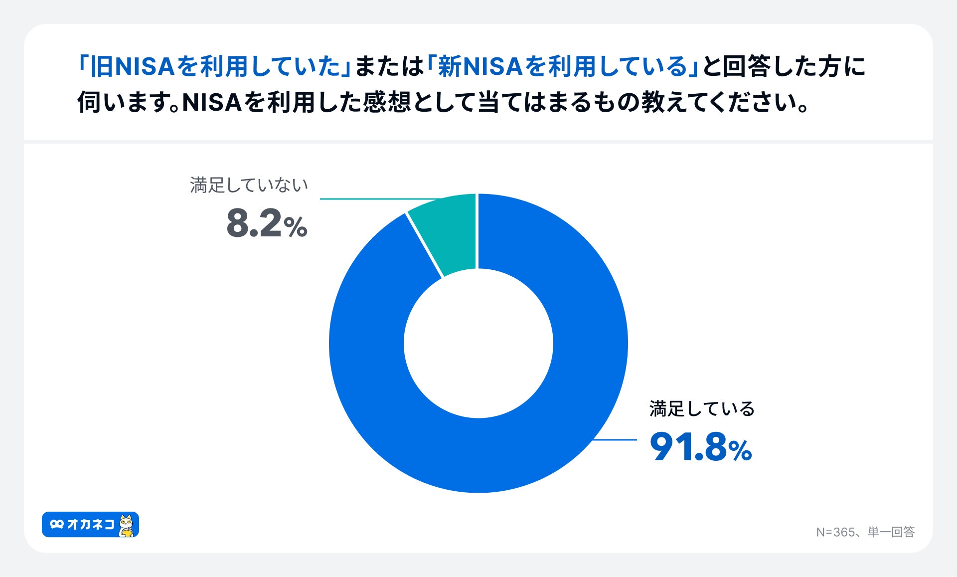 「旧NISAを利用していた」または「新NISAを利用している」と回答した方へ「NISAを利用した感想として当てはまるものを教えてください」と質問したところ、「満足している」91.8%、「満足していない」8.2%という結果になりました。