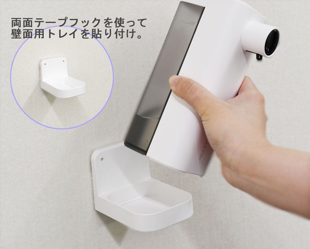 付属の壁面用トレーを両面テープで張り付ければ、置き場所を選ばず設置することが可能です。