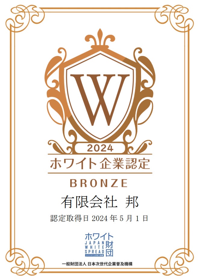 有限会社邦様が、一般財団法人日本次世代企業普及機構(通称:ホワイト財団)が運営する「ホワイト企業認定 ブロンズランク」を取得しましたことをお知らせいたします。