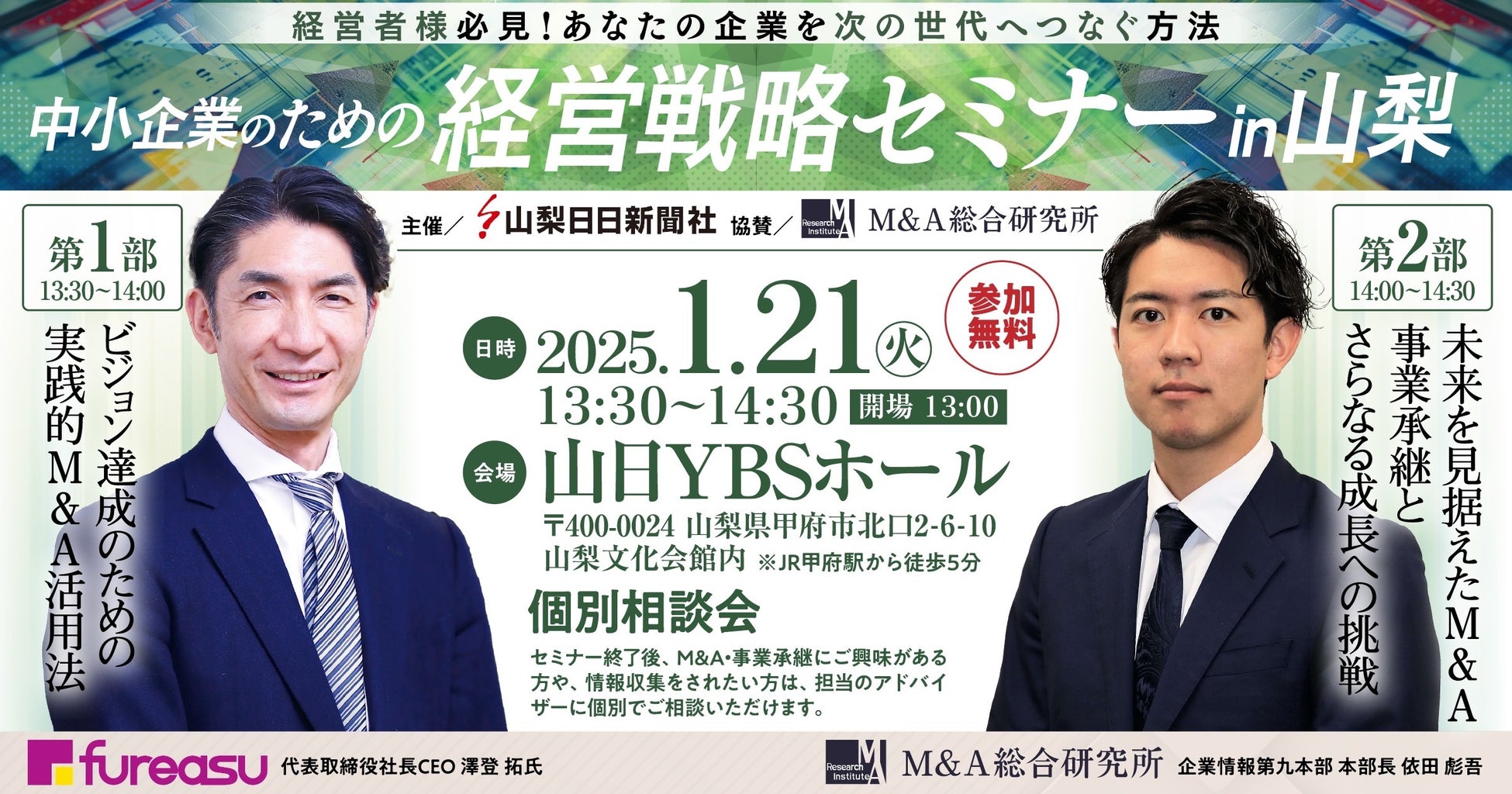 株式会社M&A総合研究所(本社:東京都千代田区、代表取締役社長:佐上 峻作、以下「当社」)は、2025年1月21日(火)に山梨県甲府市でM&A・事業承継に関するセミナーを実施いたします。