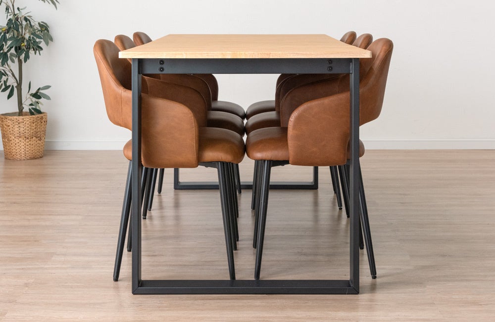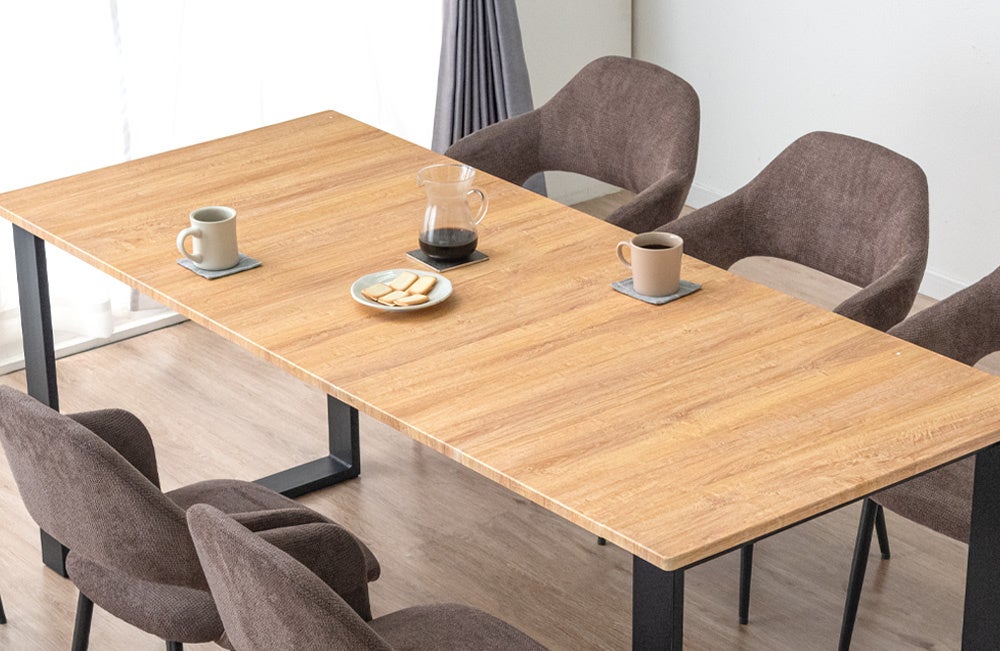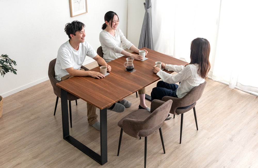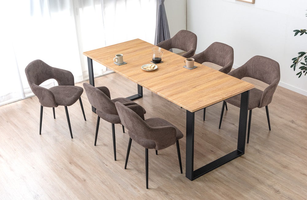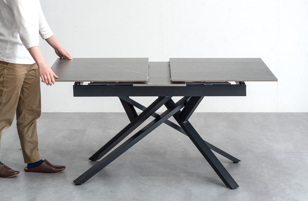 本製品もロの字脚デザインのブラックアイアンを搭載することで、これまでの伸長式ダイニングテーブルの脚部の中でも最も存在感のあるデザインに仕上がりました。